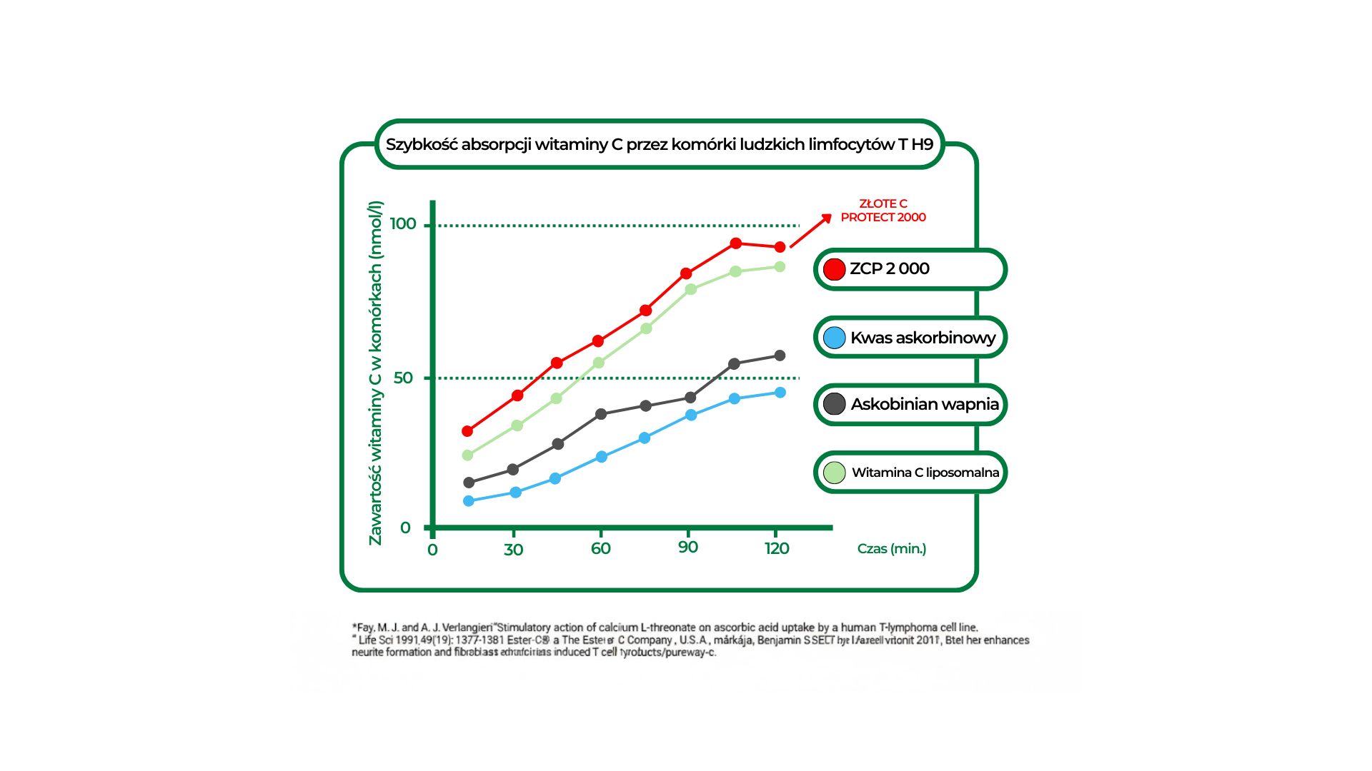 Badania wykazały, że Złote C PROTECT 2000 ma dotychczas najwyższą biodostępność, mierzoną bezpośrednio w ludzkich białych krwinkach, spośród doustnych witamin C* (zob. wykres poniżej).